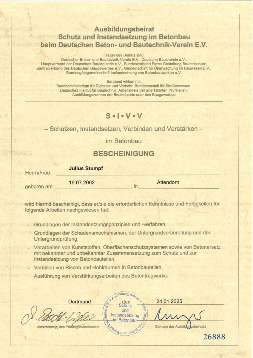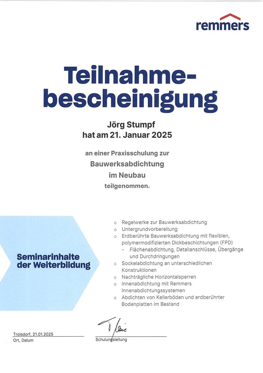 TÜV-Süd Zertifizierte Fachkraft für Abdichtung und Feuchtesanierung von erdberührten Bauteilen